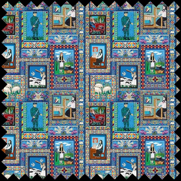 Descoperă farmecul autentic al artei naive reinterpretat într-un material textil decorativ premium, inspirat de universul vibrant și plin de simboluri al tradițiilor românești. Modelul Ornament surprinde scene de viață, personaje epopeice și motive folclorice, zugrăvite cu umor și culoare de către designerii noștri, pe un fundal profund, dominat de nuanțe de Albastru de Săpânța. Fiecare detaliu pictat manual evocă povești emoționante și aduce omagiu zestrei culturale, transformând orice spațiu într-o galerie de amintiri vii.